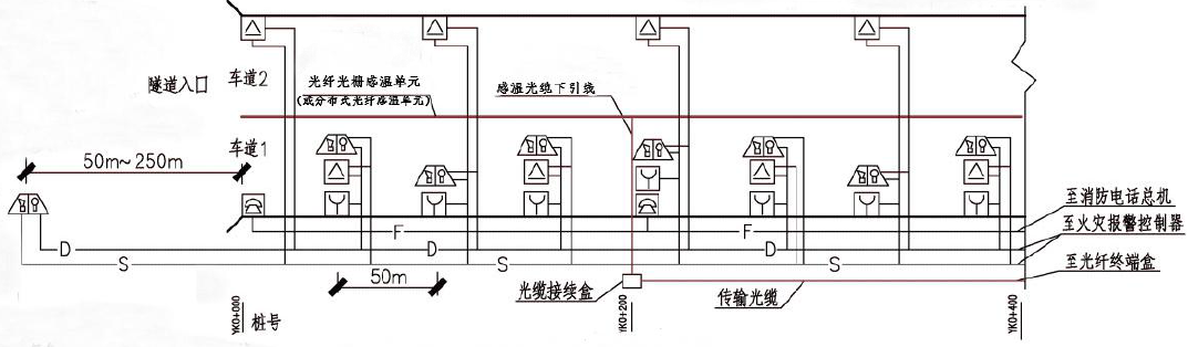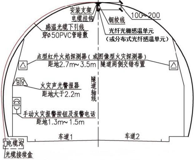 分布式光纖線(xiàn)型感溫火災(zāi)探測(cè)器(或光纖光柵線(xiàn)型感溫火災(zāi)探測(cè)器)應(yīng)設(shè)置在車(chē)道頂部距頂棚100mm~200mm,光纖光柵線(xiàn)型感溫火災(zāi)探測(cè)器的光柵間距不應(yīng)大于10m;每根分布式光纖線(xiàn)型感溫火災(zāi)探測(cè)器和光纖光柵線(xiàn)型感溫火災(zāi)探測(cè)器保護(hù)車(chē)道的數(shù)量不應(yīng)超過(guò)2 條;探測(cè)范圍要求整個(gè)隧道全部覆蓋無(wú)探測(cè)盲區(qū)。