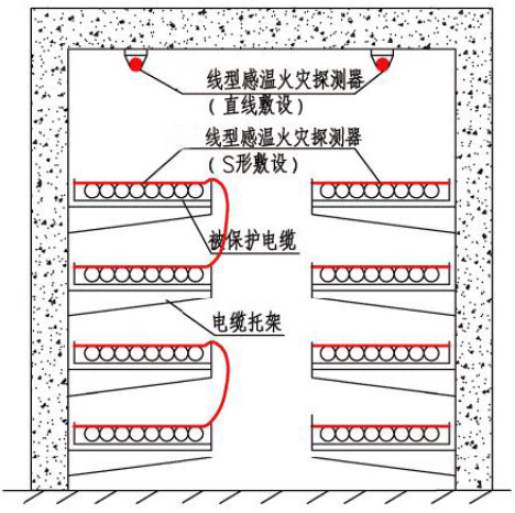 隧道內(nèi)應(yīng)沿電纜設(shè)置線(xiàn)型感溫火災(zāi)探測(cè)器,且在電纜接頭端子等發(fā)熱部位應(yīng)保證有效度;隧道內(nèi)設(shè)置的線(xiàn)型感溫火災(zāi)探測(cè)器可接入電氣火災(zāi)監(jiān)控系統(tǒng)。無(wú)外部火源進(jìn)入的電纜隧道應(yīng)在電纜層上表面設(shè)置線(xiàn)型感溫火災(zāi)探測(cè)器;有源入可能的電纜隧道在電纜層上表面和隧道頂部,均應(yīng)設(shè)置線(xiàn)型感溫火災(zāi)探測(cè)器。線(xiàn)型感溫火災(zāi)探測(cè)器采用“S”形布置或有外部火源進(jìn)入可能的電纜隧道內(nèi),能響應(yīng)火焰規(guī)模不大于100mm 的線(xiàn)型感溫火災(zāi)探測(cè)器。如圖3所示: