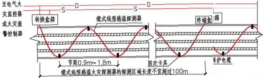 圖6.線(xiàn)型感溫火災(zāi)探測(cè)器在電纜接頭處敷設(shè)的示意圖