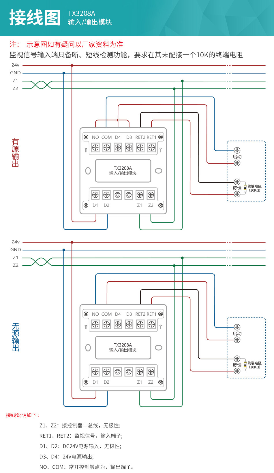 注意:模塊的反饋輸入端具備斷、短線檢測功能,要求在其末端配接一個10K的終端電阻,否則控制器將報出該產(chǎn)品反饋端故障;對于控制線也具備斷、短線檢測功能,當模塊不動作時,要求常開輸出端的電壓在DC12-48V之間,否則控制器將報出該模塊輸出線故障。