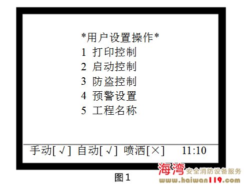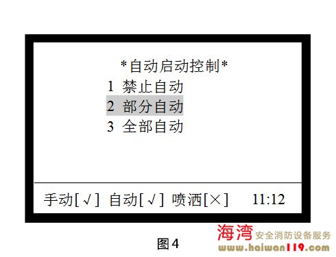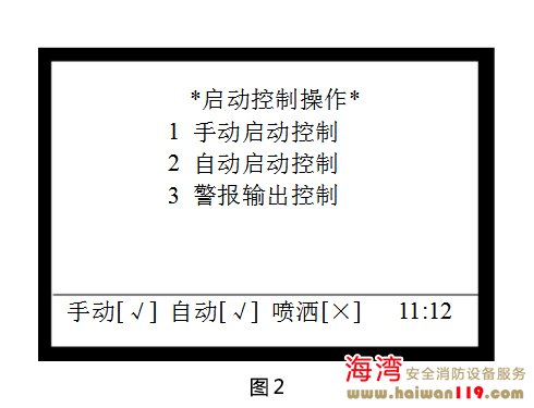 啟動控制設(shè)置 在圖1所示界面下,按2進入“啟動控制”界面,調(diào)出啟動控制操作菜單,如圖2所示,包含手動啟動控制、自動啟動控制、警報輸出控制的設(shè)置,可通過按下其對應的數(shù)字鍵進行相關(guān)的設(shè)置